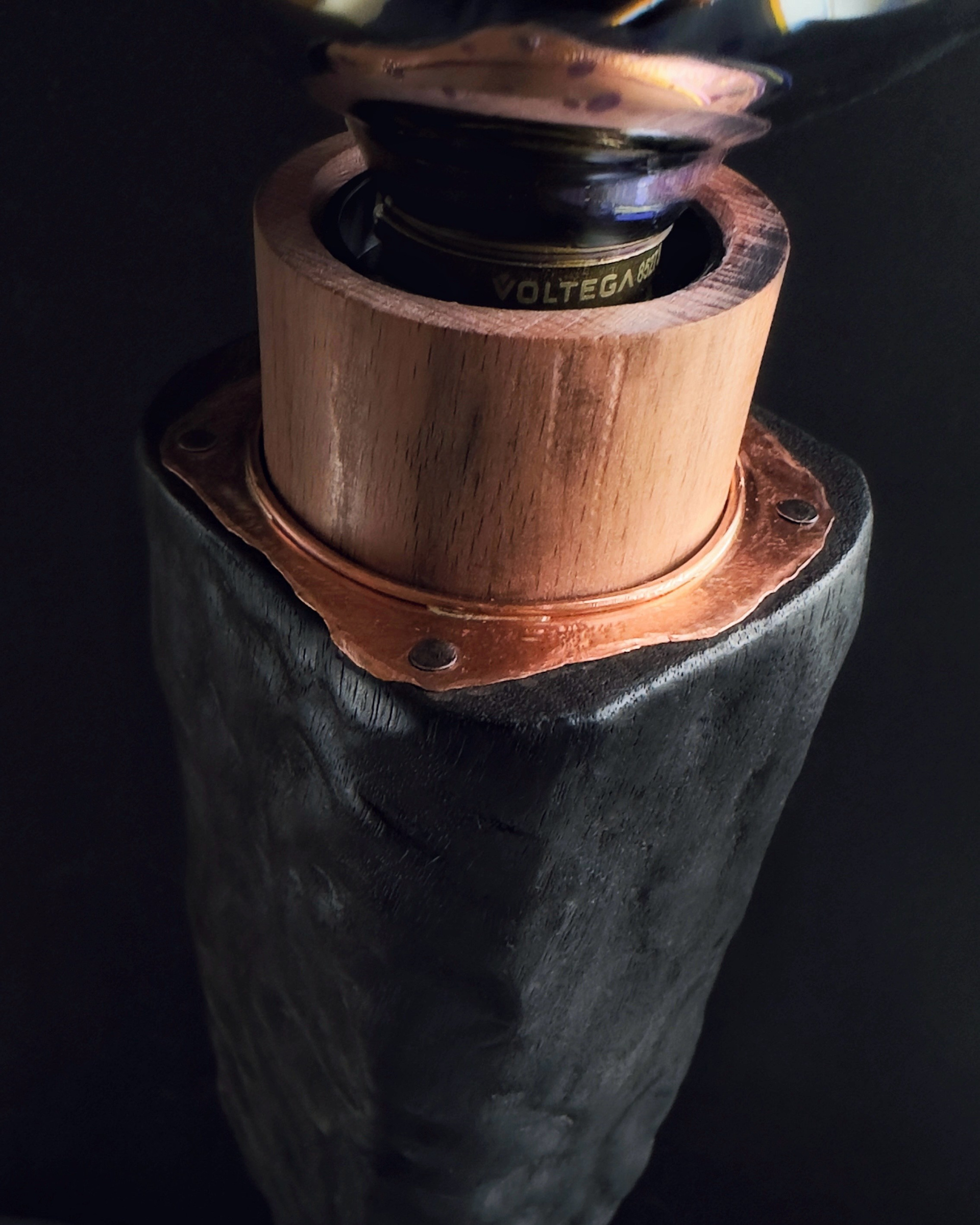 Спил дуба, обожженый по японской технологии yakisugi, масло, декоративные элементы из меди