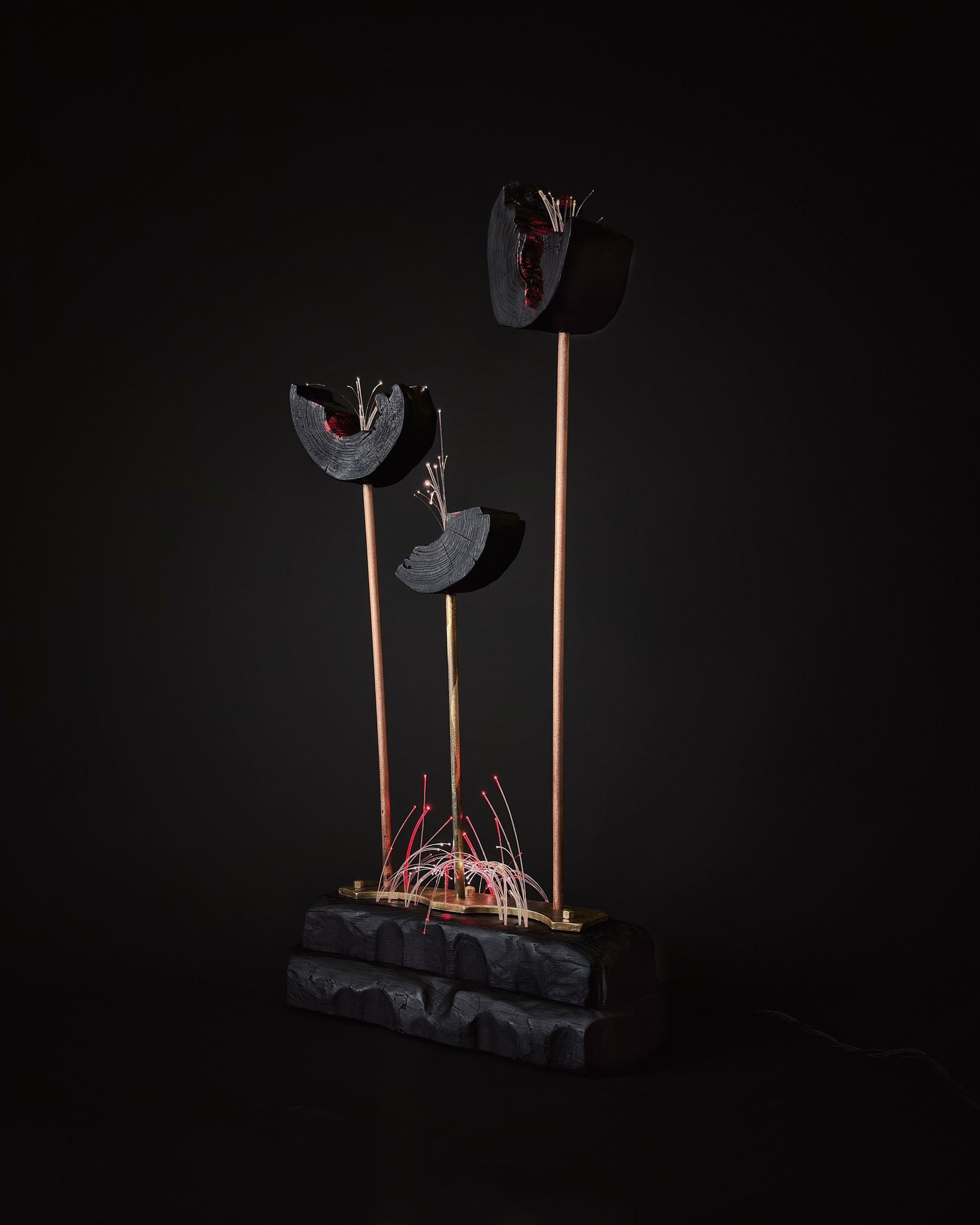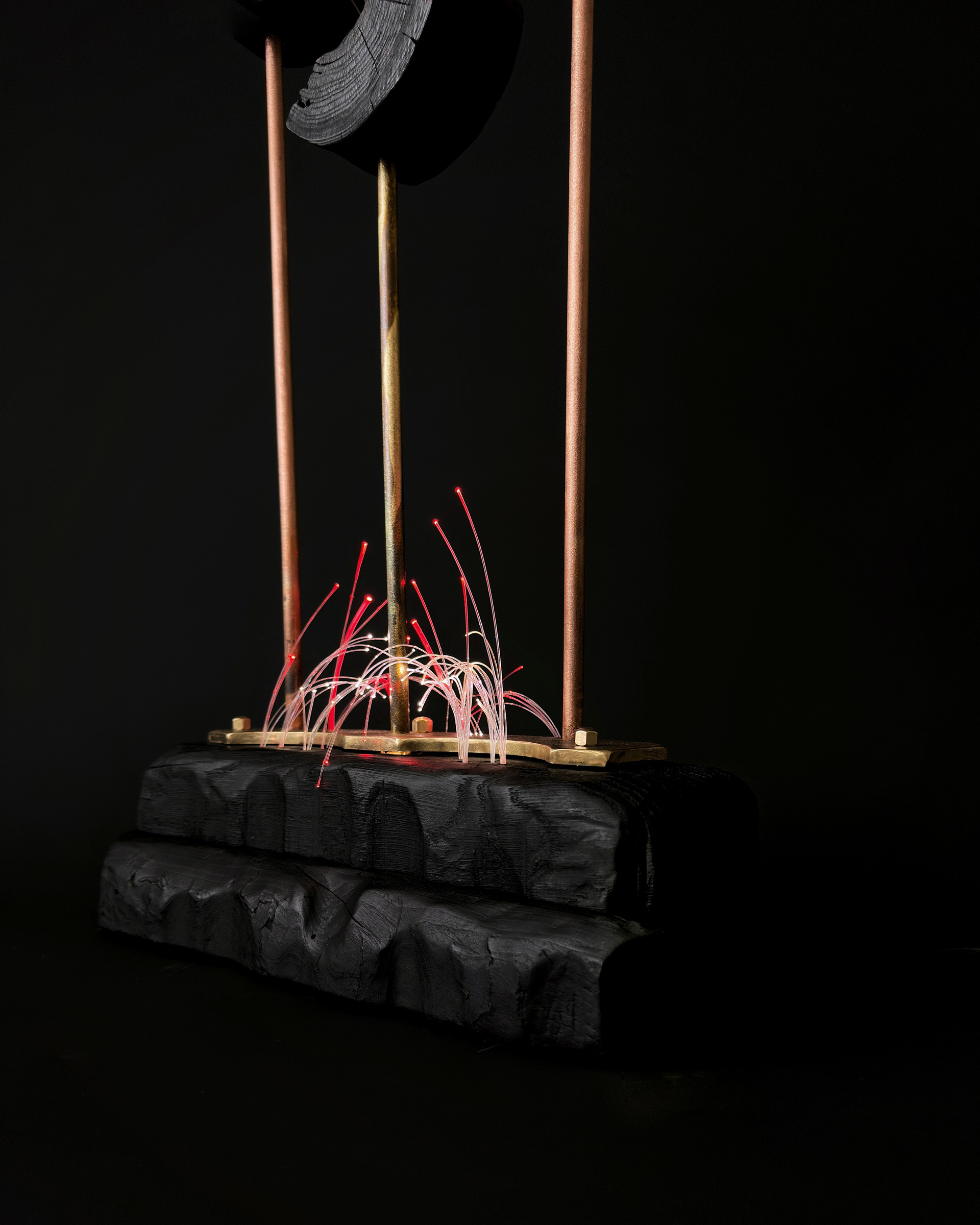 дерево (ясень, акация), масло, латунь, медь, обжиг по технологии yakisugi, художественное патинирование, поталь, оптоволокно