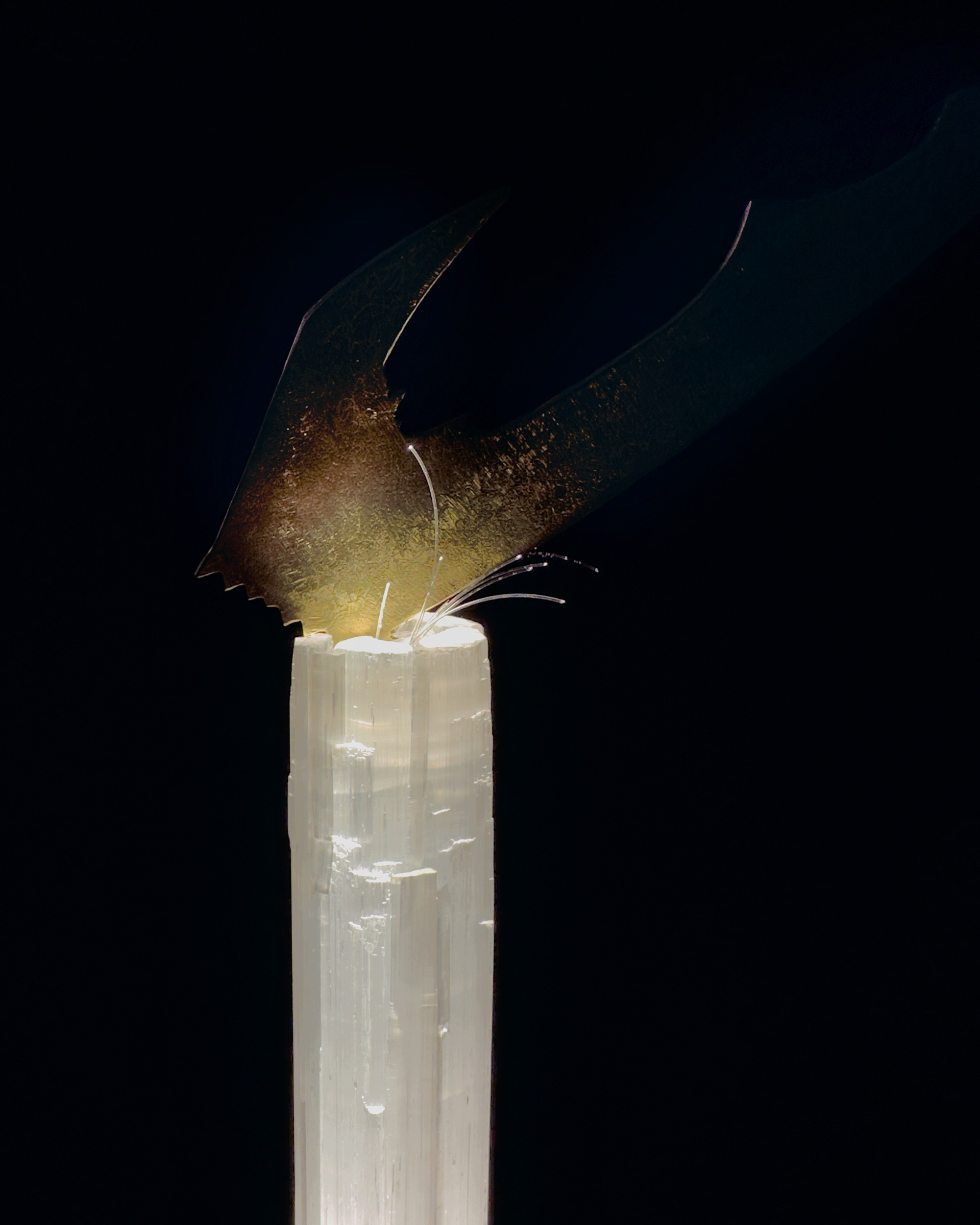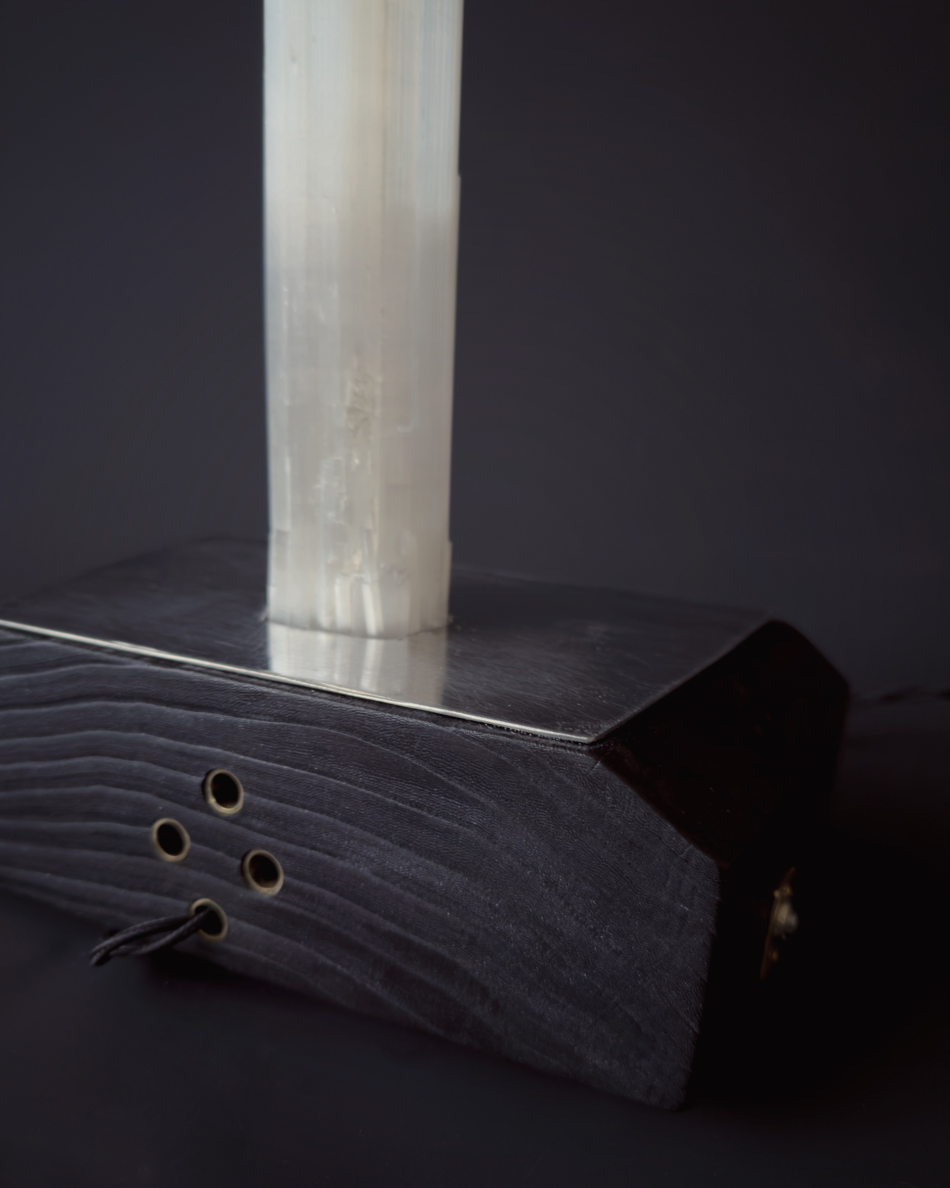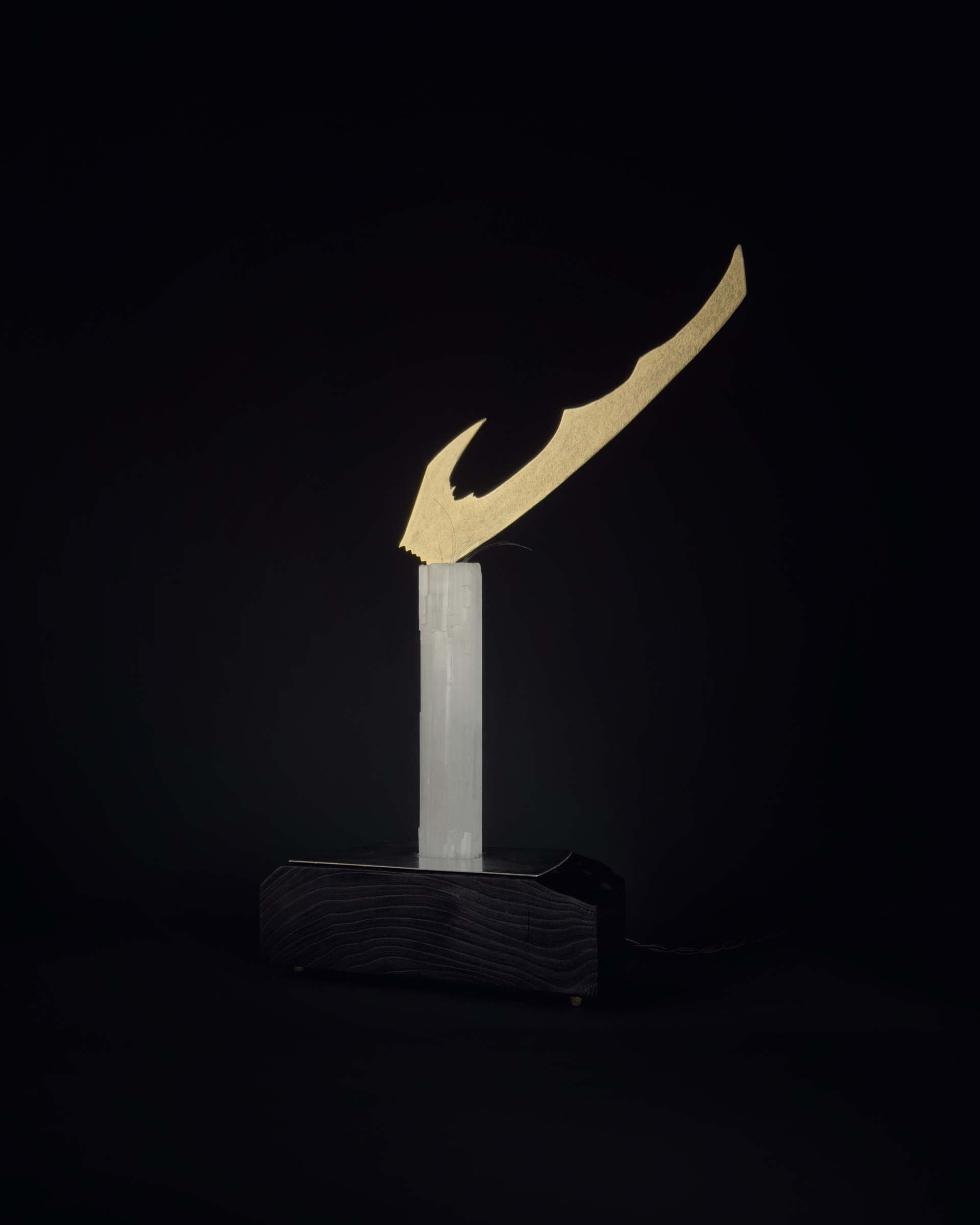 дуб, обожжённый в технике yakisugi, латунь, природный селенит, итальянская электрика, оптоволокно, сталь.