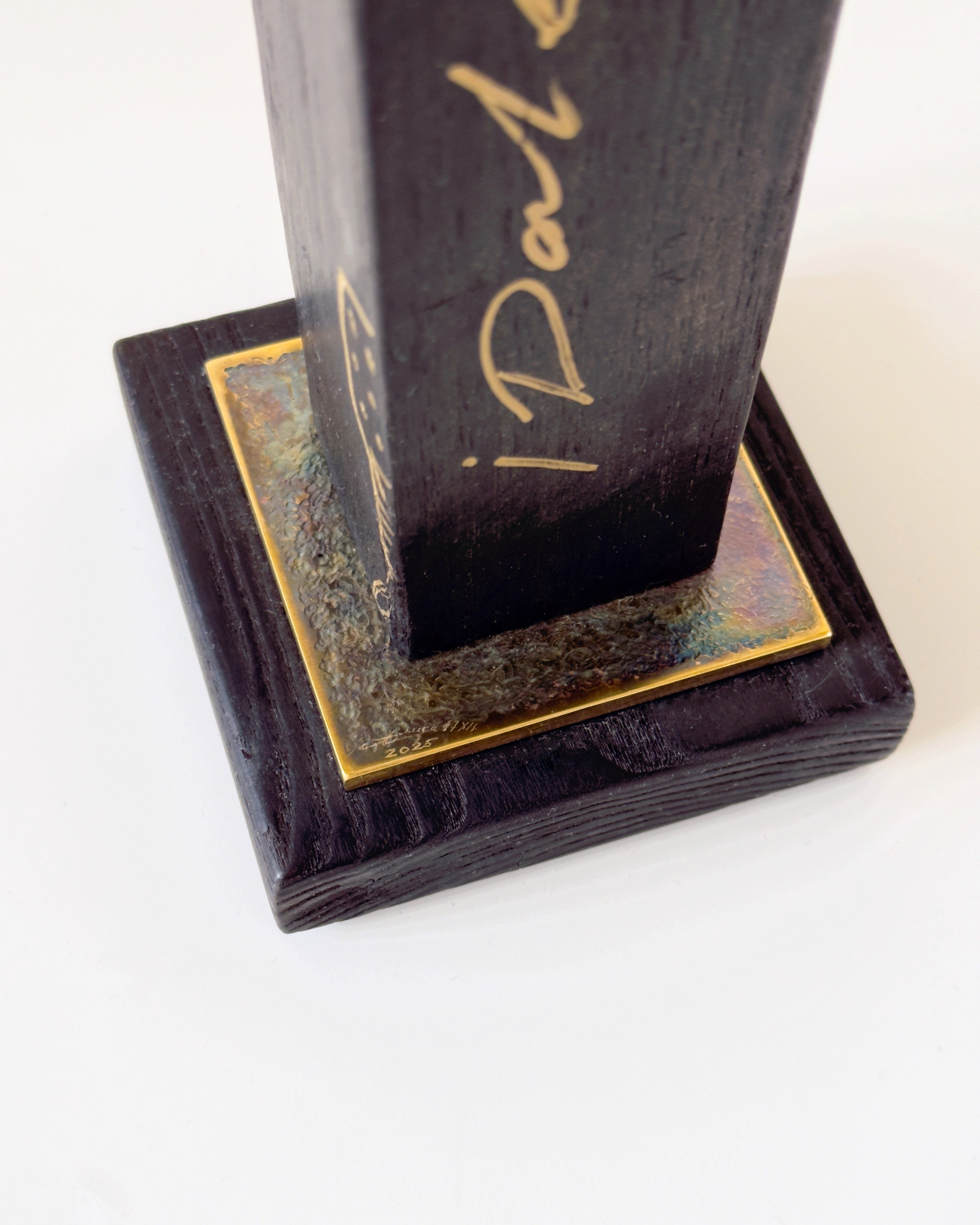 дуб, обожжённый в технике yakisugi, латунь, художественная патина